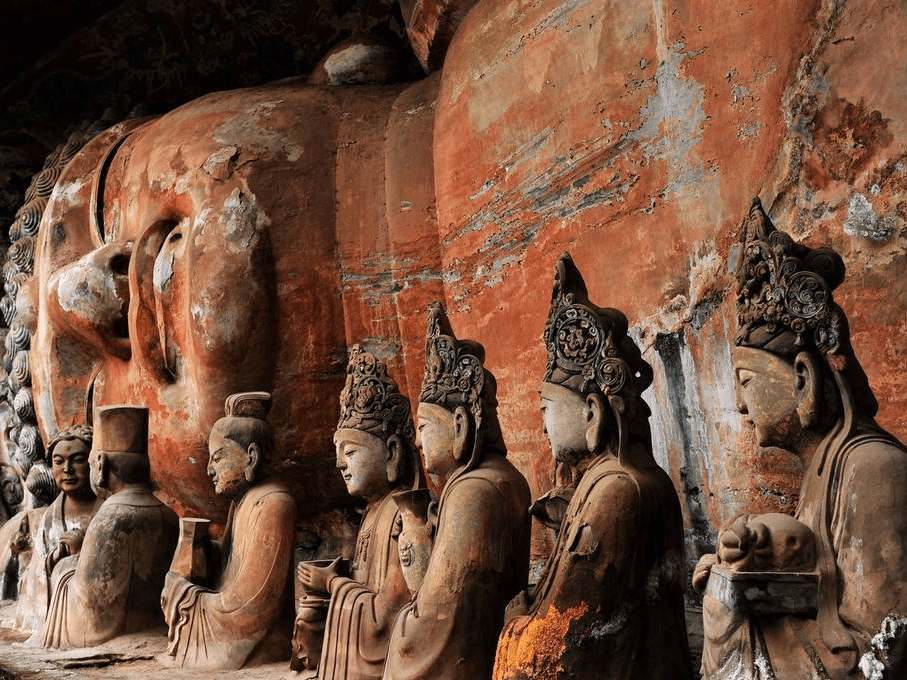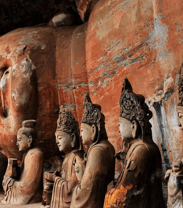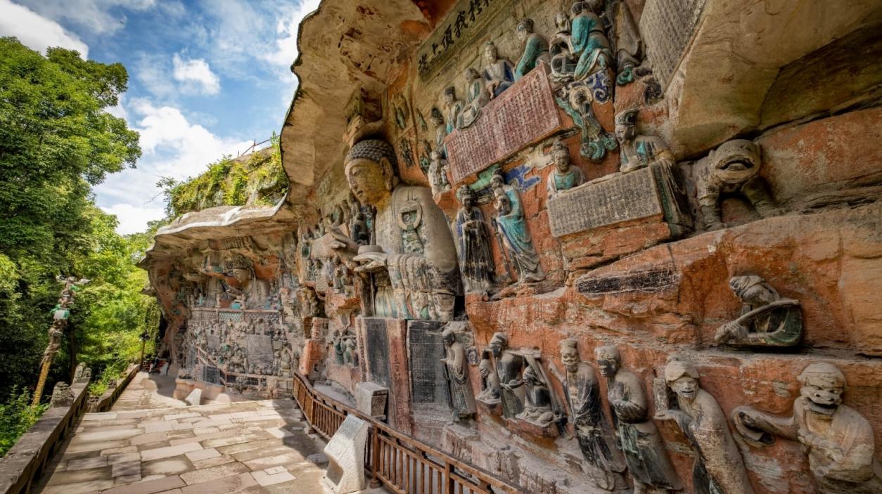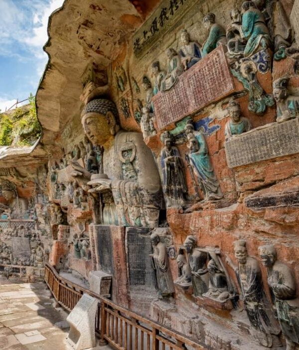 Dazu Grottoes, 163km from Chongqing, refers to 75 cliff carving sites in Dazu County with over 50,000 statues and 100,000 character inscriptions. Beginning in 650 AD (Tang Dynasty) and continuing through the Qing Dynasty, this UNESCO World Heritage site (1999) ranks alongside Dunhuang frescoes and forms a trilogy with Yungang and Longmen Grottoes. The main sites are North Hill (Beishan) and Baoding Hill (Baodingshan).