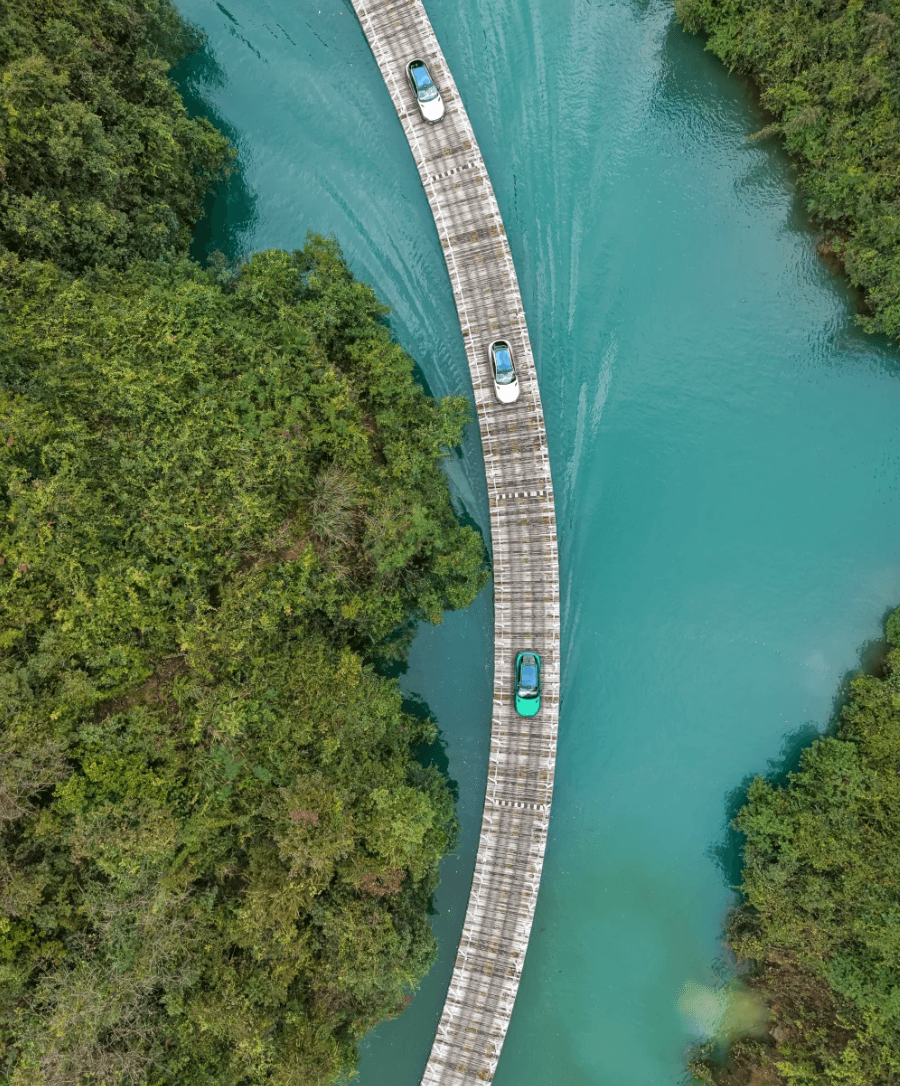• Shiziguan: Driving through a 500m S-shaped floating bridge.
